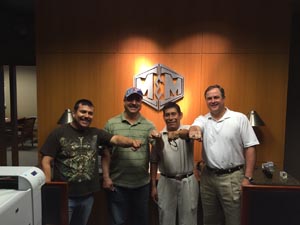 Left to right are Luis Rojo, Jose Rojo, Francisco Arellanes and Rob Felton, CEO, as they are congratulated upon presentation of their M&M 20 year gold ring. Luis works in the IB department, Jose works in the shipping department, and Francisco works in the shipping department at the North Fort Worth plant.