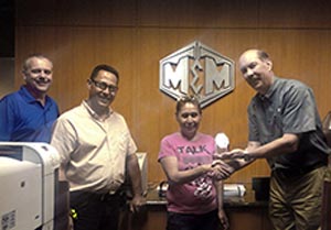 Left to right are Jeff Wilson, Supervisor, Daniel Espinoza, Shop Foreman, Cristina Cruz, and Keith Highland, COO congratulating Cristina upon presentation of her M&M 25 year Crystal. Cristina works in the Fitting Department at the North Fort Worth plant.M&M is ...Continue Reading