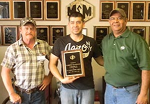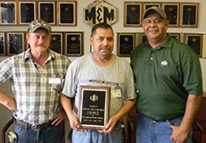 Jerry Bell, Shop Supervisor (L) congratulates Pascual Beltran (C) upon presentation of his M&M 15 year plaque with Sam Mendez, Rectangular Supervisor (R). Pascual is a Production Worker in the M&M Dallas plant.Thank you Pascual for 15 years of service.Continue Reading